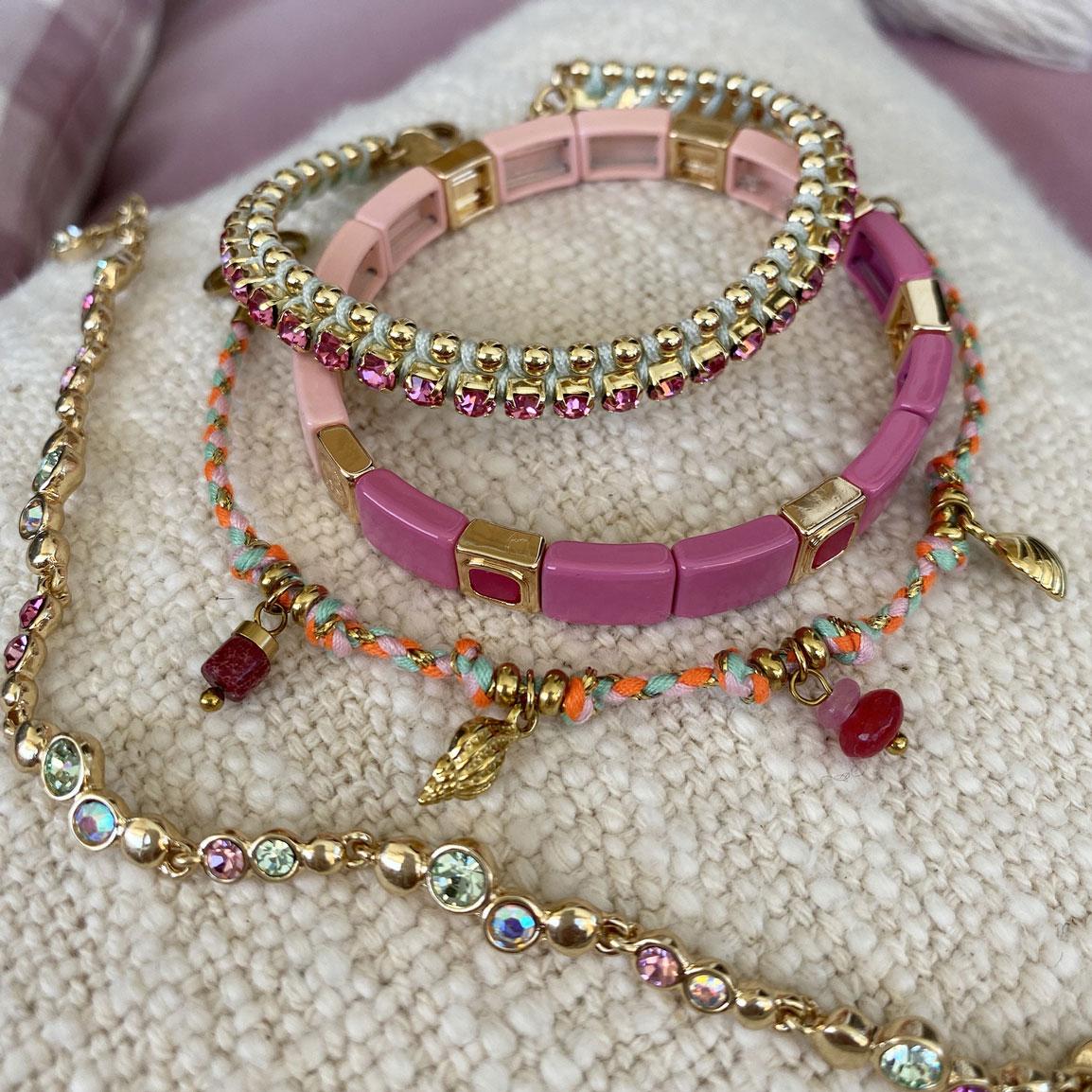 Armband frå Happy Life-serien – som består av fargerike og leikne smykker fletta av tråd, steinperler og strandinspirerte anheng. Desse er som skapt for lag-på-lag, der du kan mikse fargar, teksturar og former nett slik du vil.