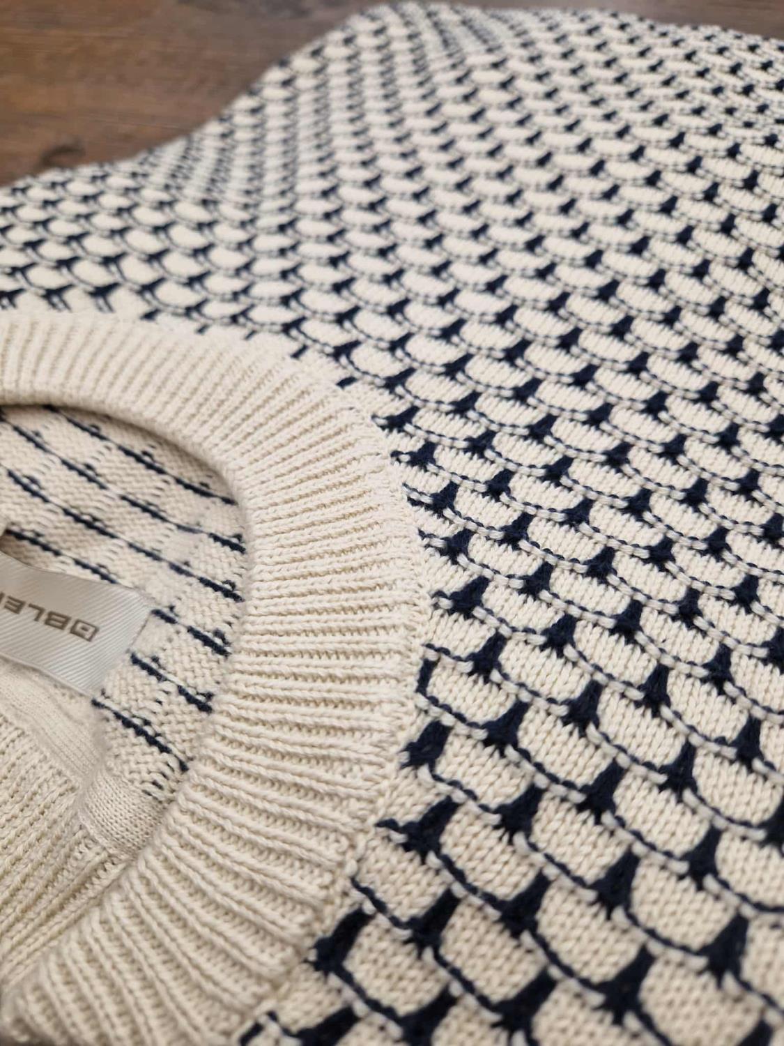 Regular fit. Rund hals med ribbestrikk, og ribbestrikk ved handledd og i livet. Mønster i strikket. Kjempefin både til jeans og svart bukse – og du kan fint ha den under blazer!