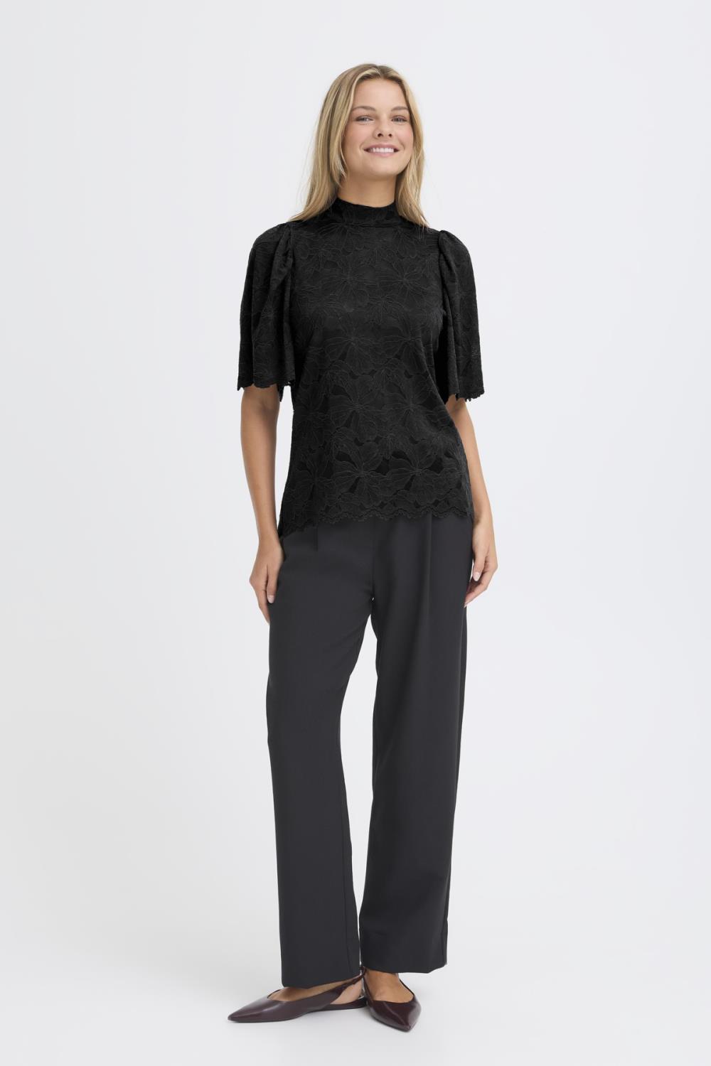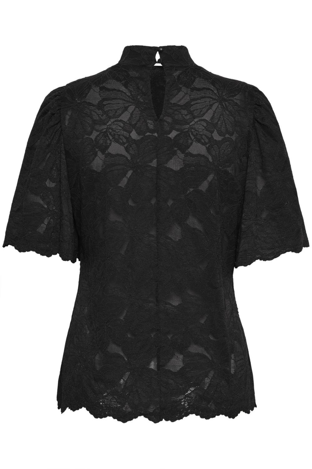 Regular fit. Rund hals med litt krage, som lukkast med to knappar i nakken. Vide trompetarmar med blondekant yst og nede i livet.