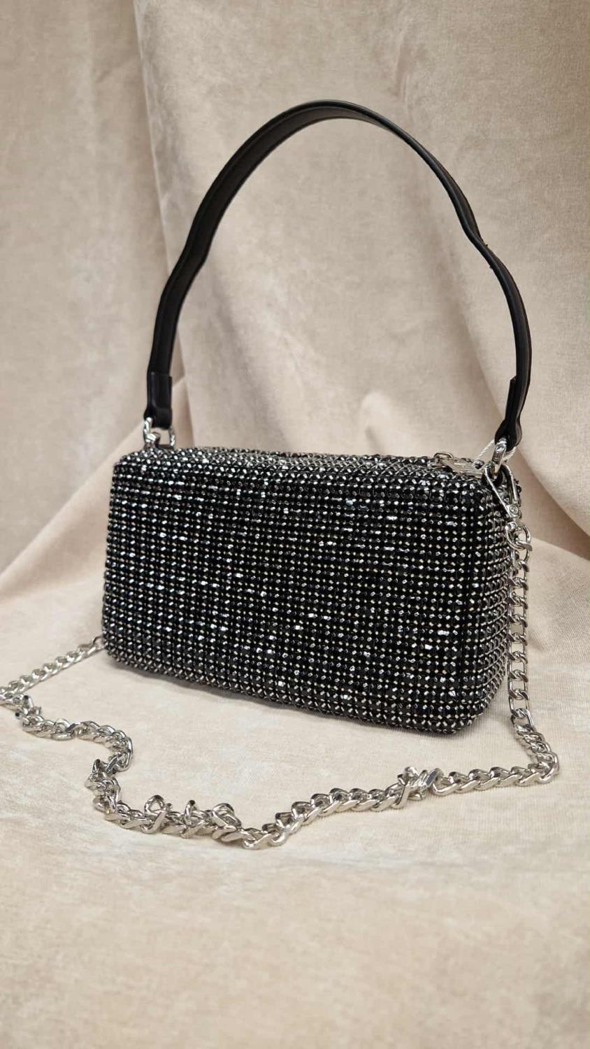 Firkanta veske med handtak i pu-skinn og crossover skulderreim i kjetting. Skulderreima er avtagbar. To korthaldarlommer inni veska.