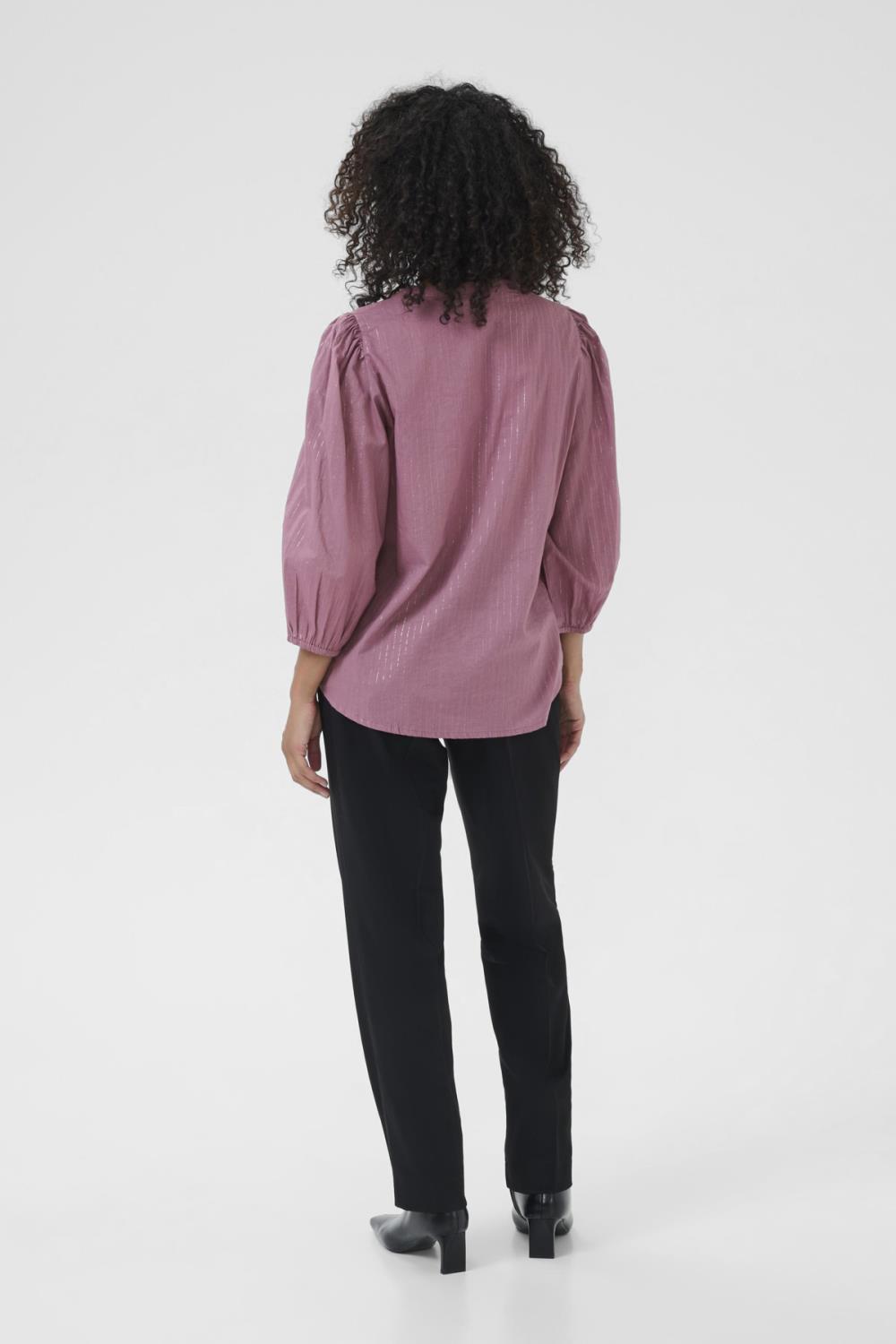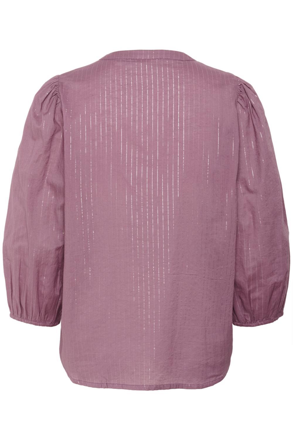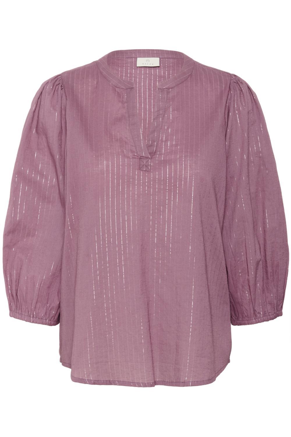 Bluse med rund hals og v-snitt framme på brystet. Strikk ved handledd.