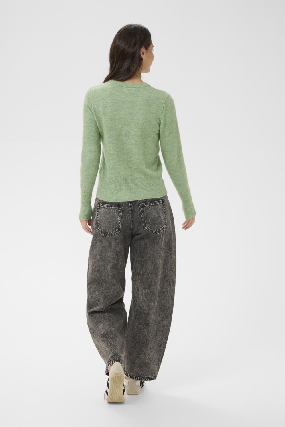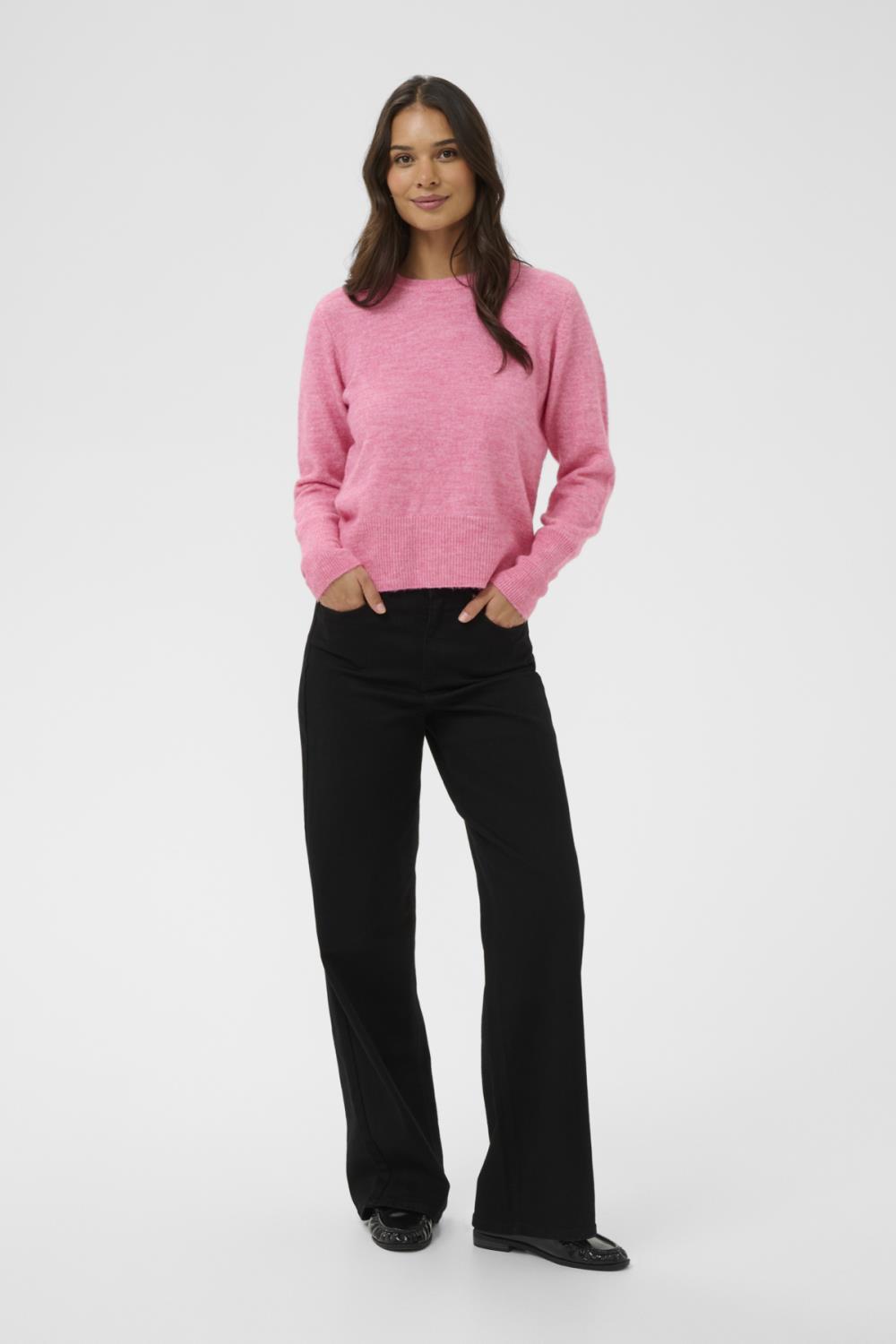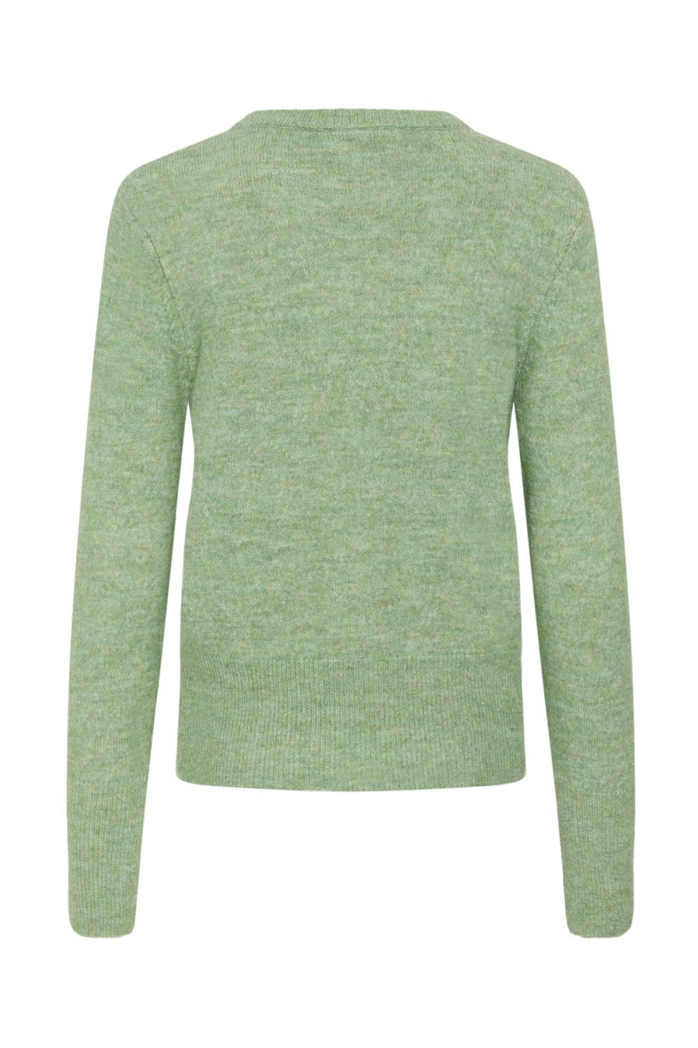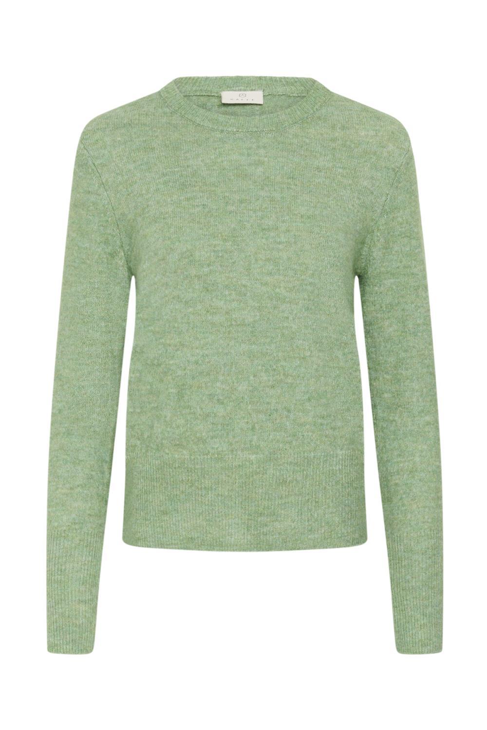 Deilig, melert strikk. Rund hals og lange ermer. Ribbestrikk i hals, ved handledd og i livet.