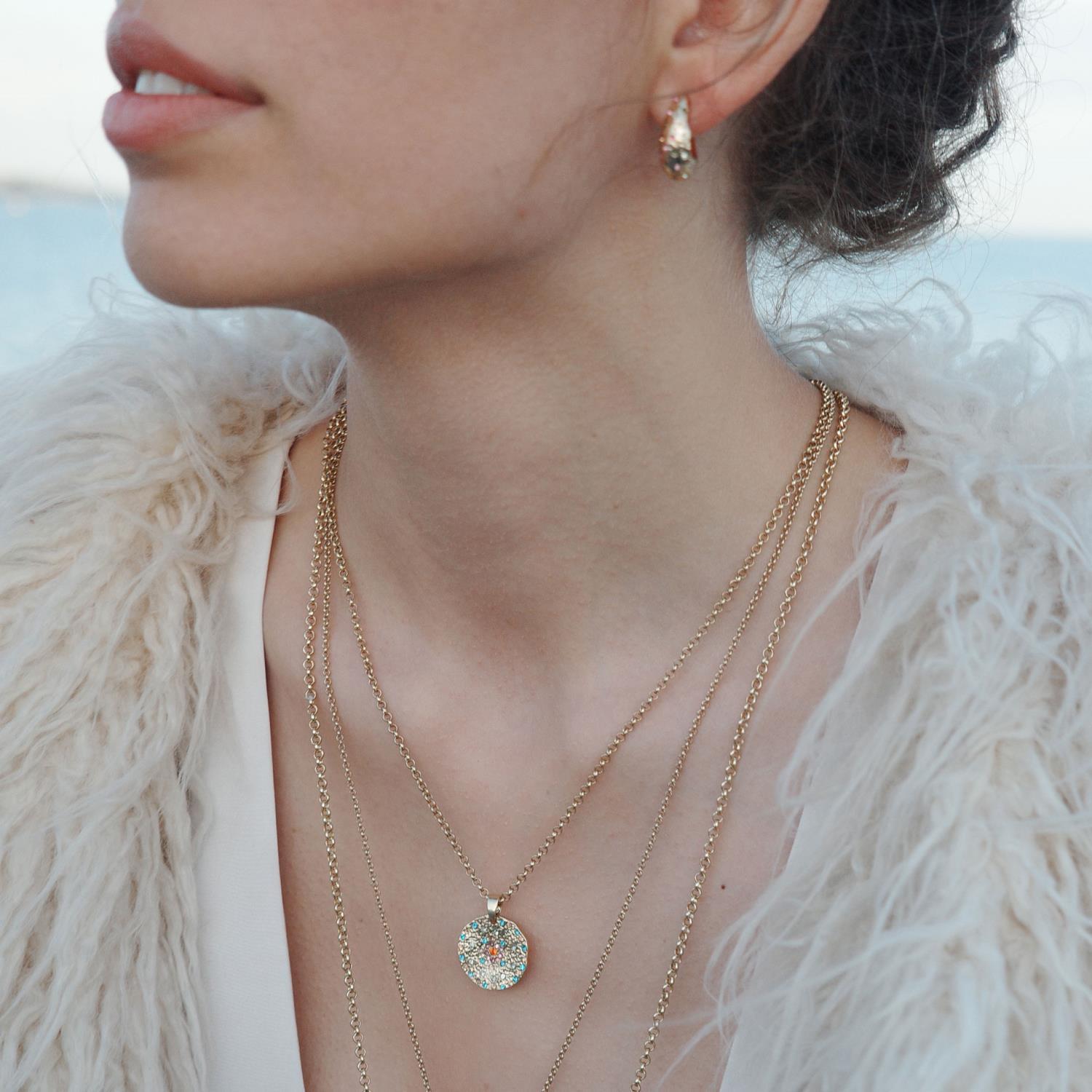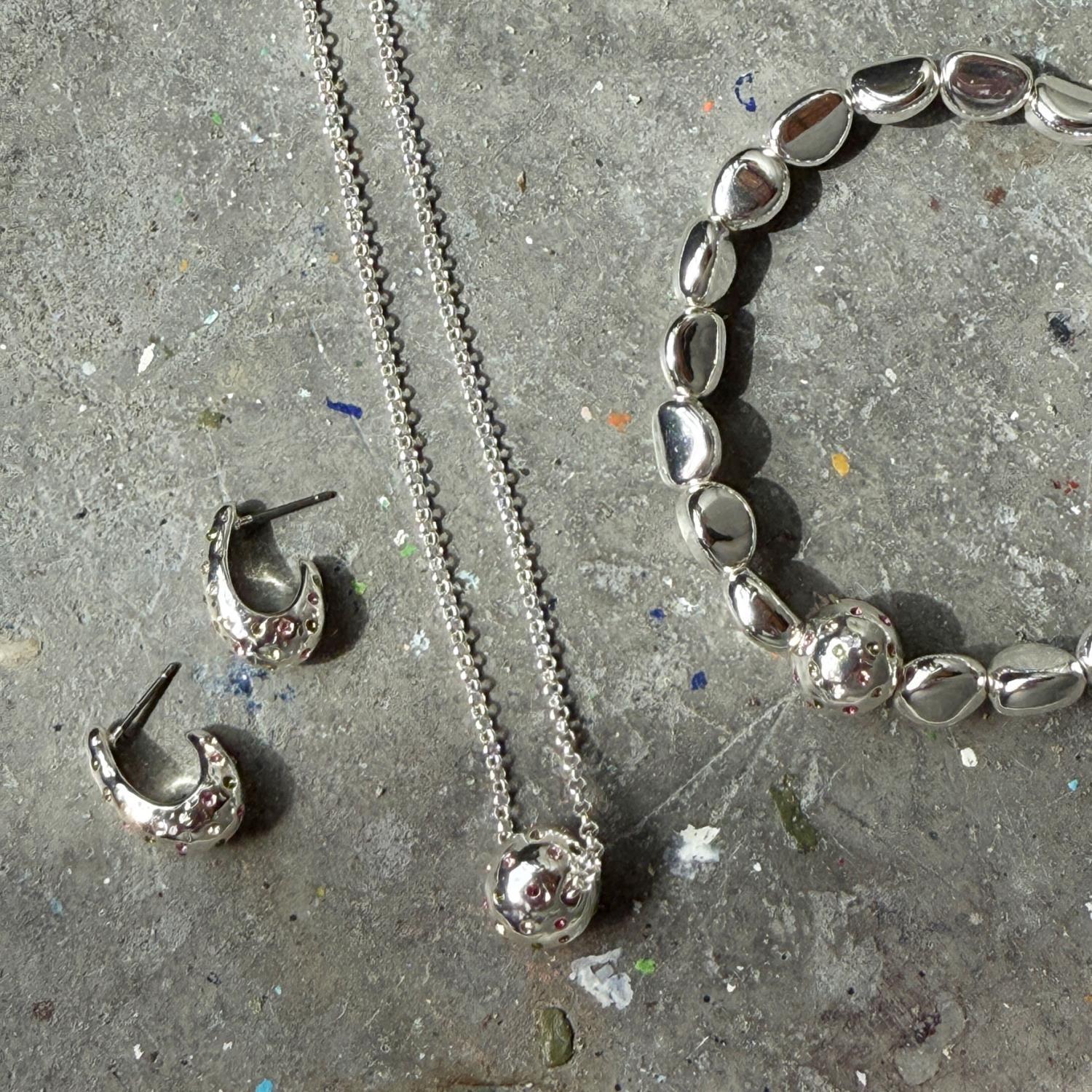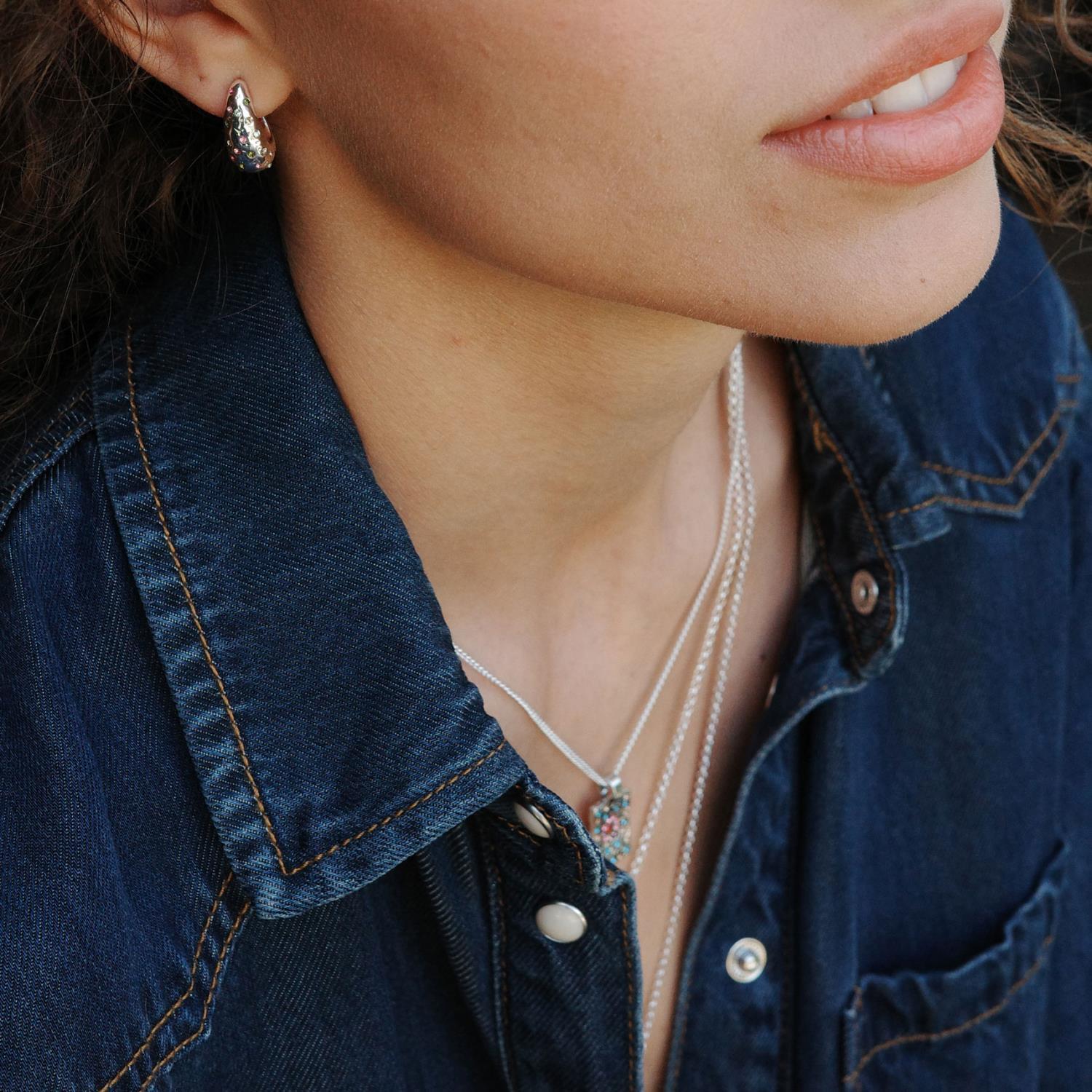 Øyrepynt frå Shimmer-serien. Shimmer består av ujamne kuler og organiske former, dekorert med små, glitrande stinar i diskrè fargar. Detaljane gjev smykka ei eksklusiv og elegant kjensle, og er vakre både aleine og saman med andre smykker. Kombiner gjerne med smykker frå Vibrance-serien som har det samme uttrykket.