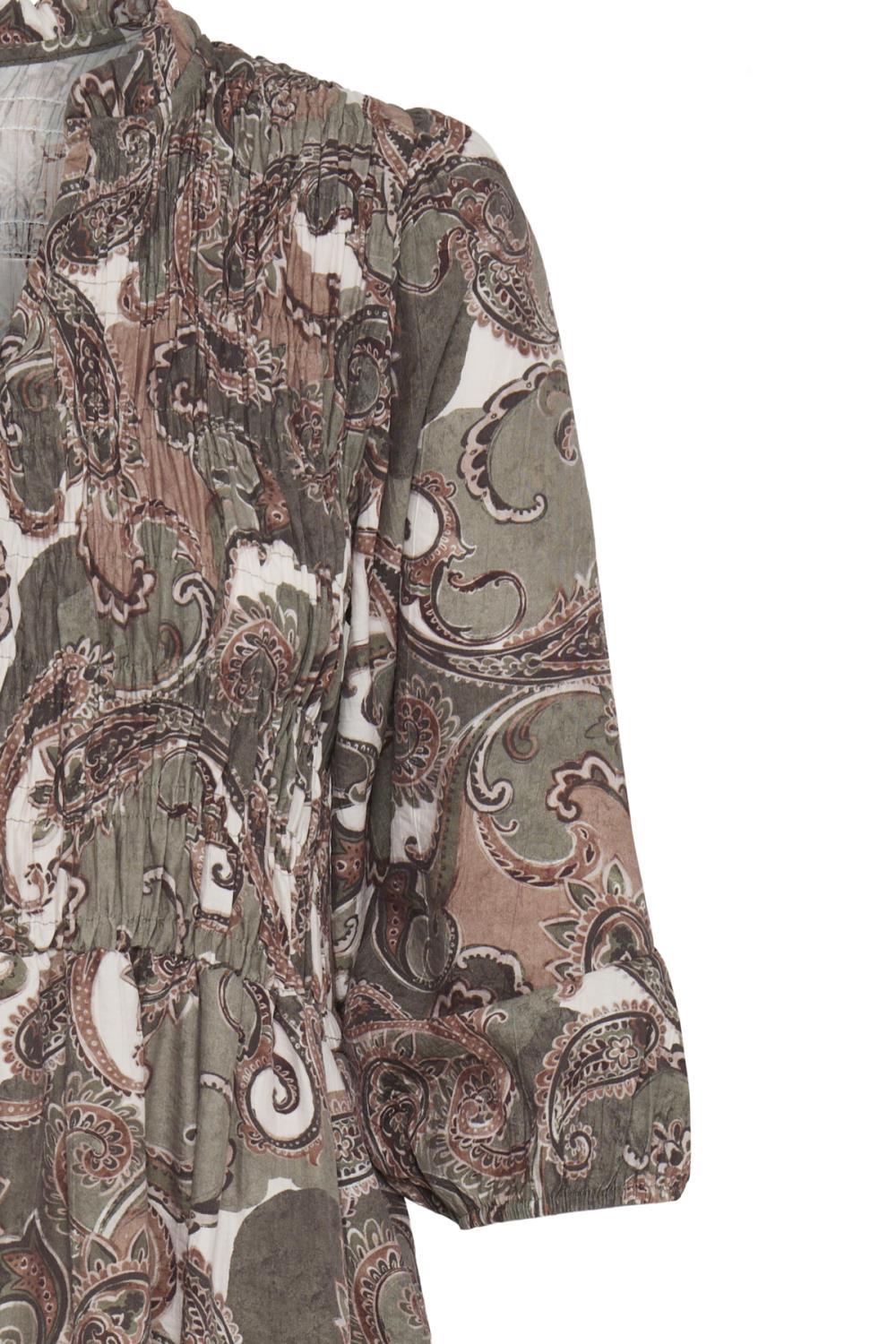 Søt haustkjole med smock i øvre halvdel. 3/4 lange ermer med strikk yst. Liten krage og v-hals. Lommar i begge sidene.