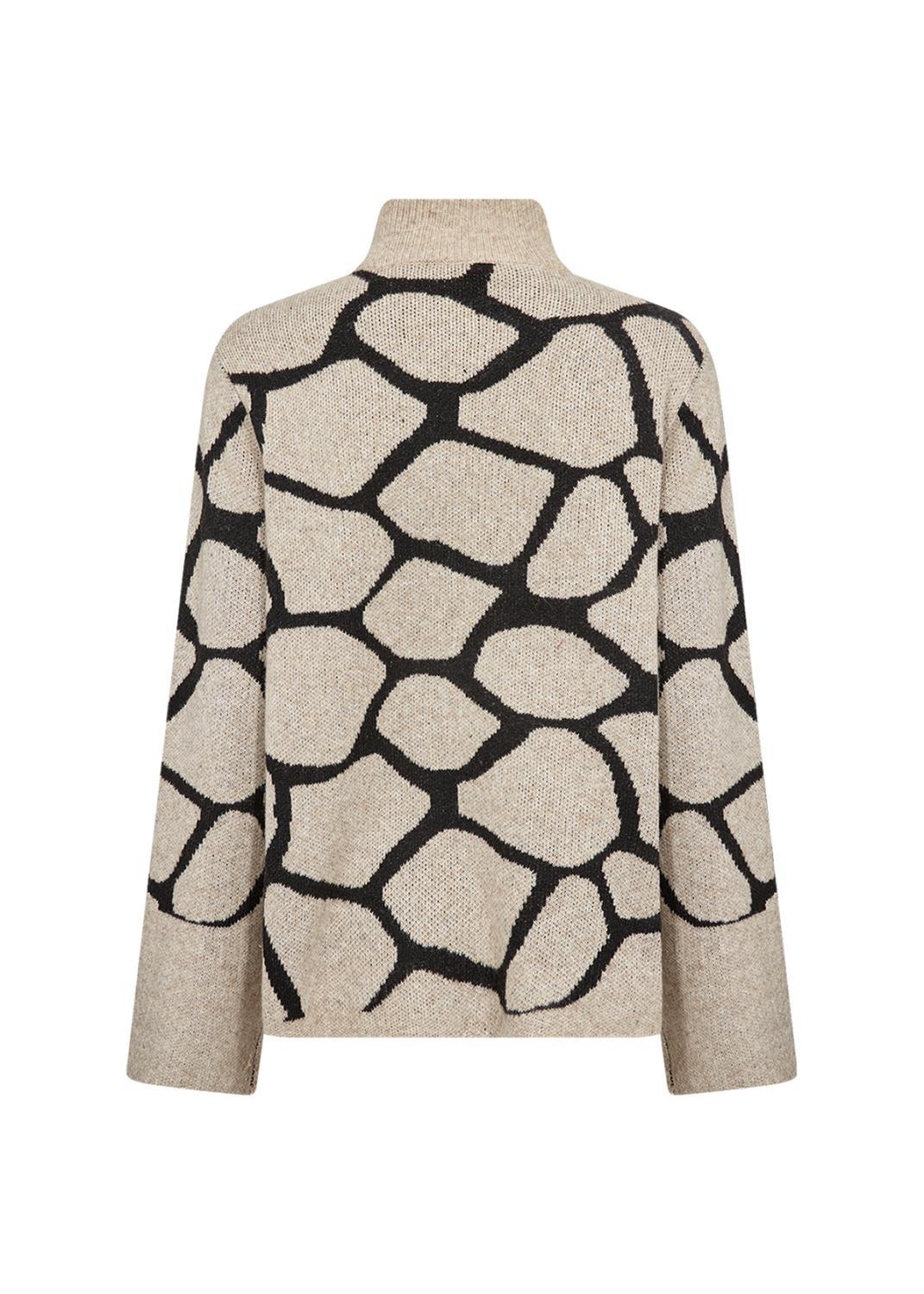 Regular fit. Herleg mønster med svarte linjer på beige strikk. Høg hals med ribbestrikk, og vide ermer.