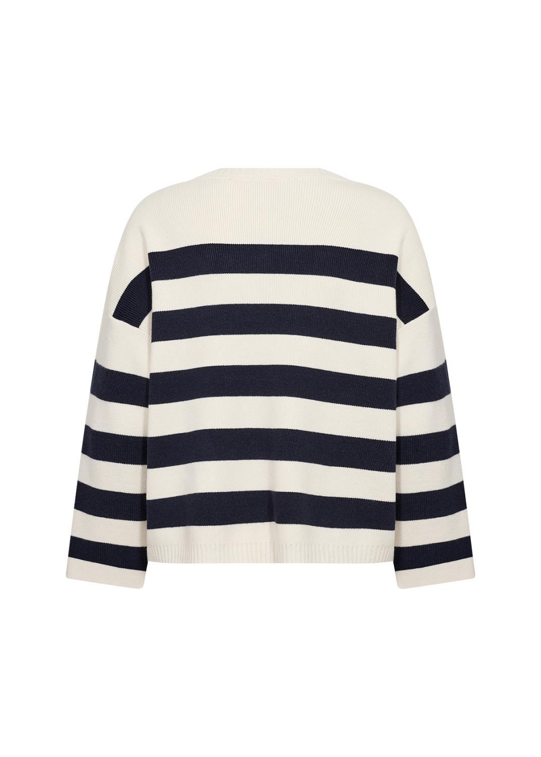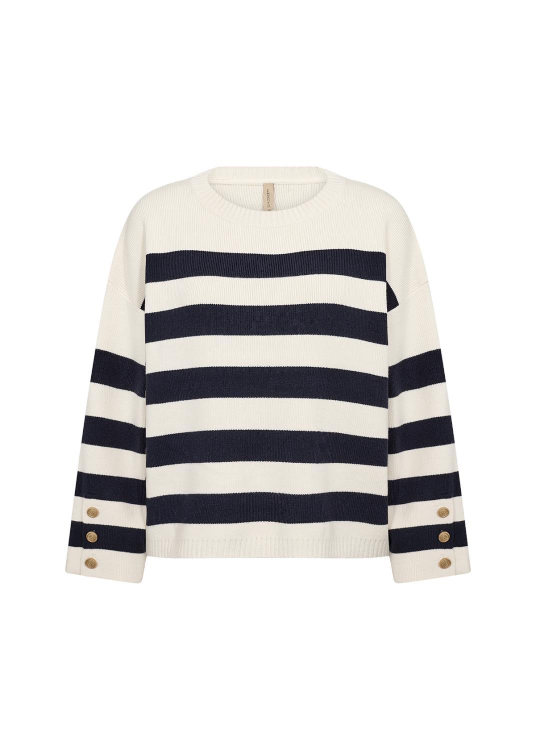 Mjuk og god, strikka gensar med horisontale striper. Søte knappedetaljar yst i erma. Rund hals med ribbestrikk, og det er ribbestrikk i livet.