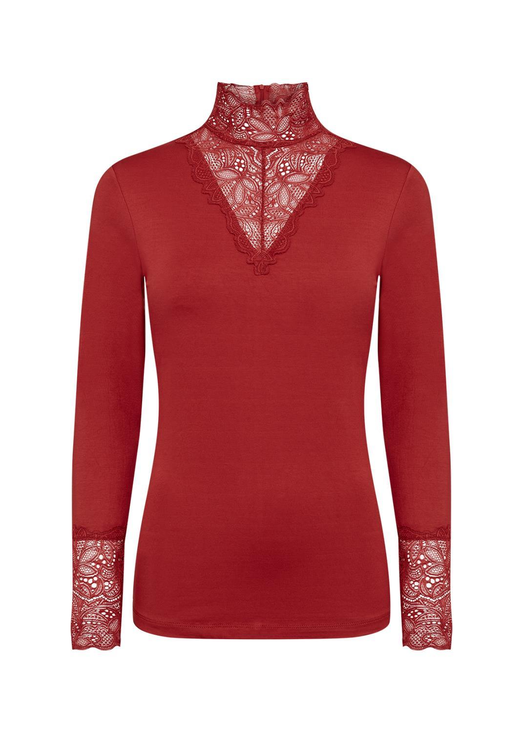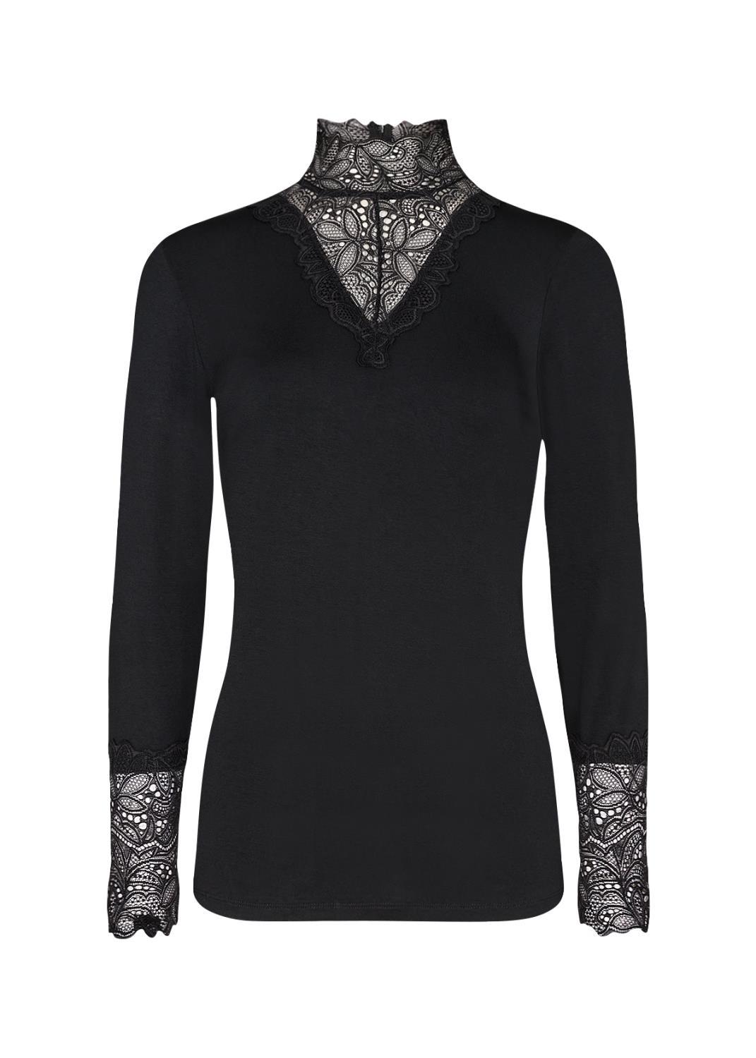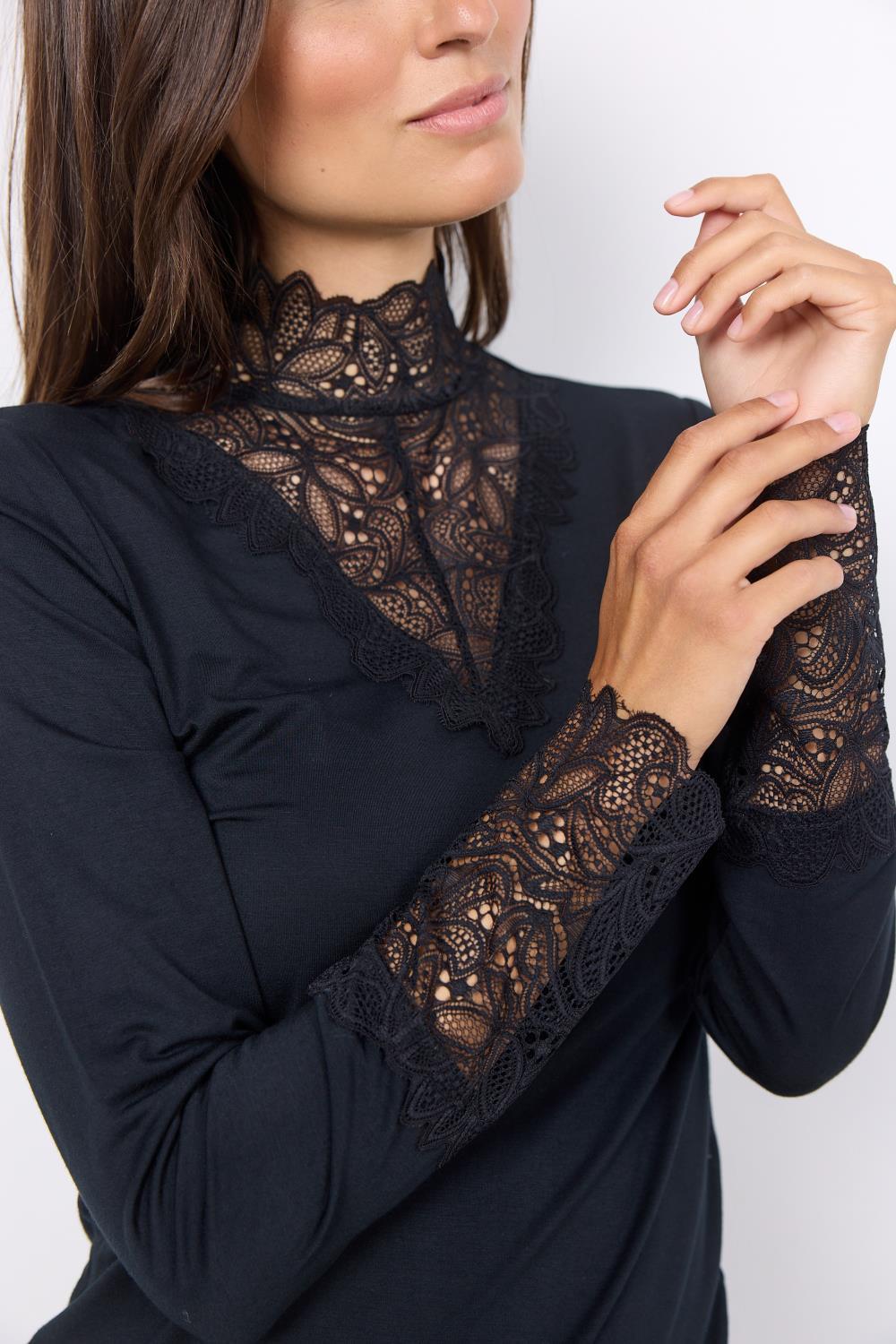 SC-Marica topp frå Soya Concept. Tynn topp med lekre detaljar. Høg blondekrage, blondene går ned på brystet, og det er blonder i erma. Glidelås i nakken. Kjempefin under dressjakke, under cardigan eller heilt aleine.